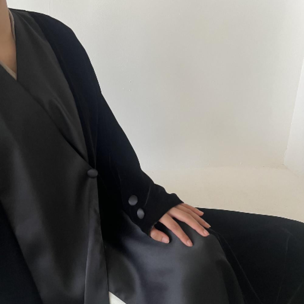 عباية فاخرة بتصميم قصة مستقيمة أنيقة وبسيطة، تجمع بين فخامة قماش المخمل الأسود ونعومة الحرير لإطلالة راقية ومميزة.